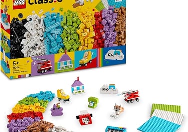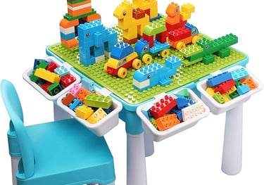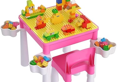 Burgkidz Toddler Table and Chair Set, Plastic Childrens Activity Table with Chair and 128 Piece Large Creative Bricks Building Construction.Yellow Baseplate